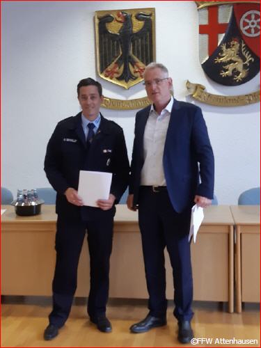 Am 28.04. wurde Sascha Wolf durch Wehrleiter Mark Horbach und Stellvertreter Carsten Reifert im Rathaus Bad Ems zum Brandmeister ernannt. Zudem wurde er durch VG-Bürgermeister Uwe Bruchhäuser in seiner Funktion als Wehrführer der Einheit Attenhausen verpflichtet.